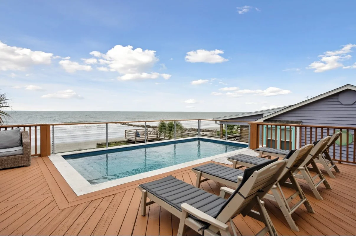 Folly Ocean Breeze on Folly Beach sleeps 12 in 5 bedrooms, meaning no couch-surfing drama here. Downstairs, you'll find a private saltwater plunge pool on the wraparound deck—perfect for splashy group hangs—while the top deck has panoramic ocean views and an alfresco dining setup right by the surf